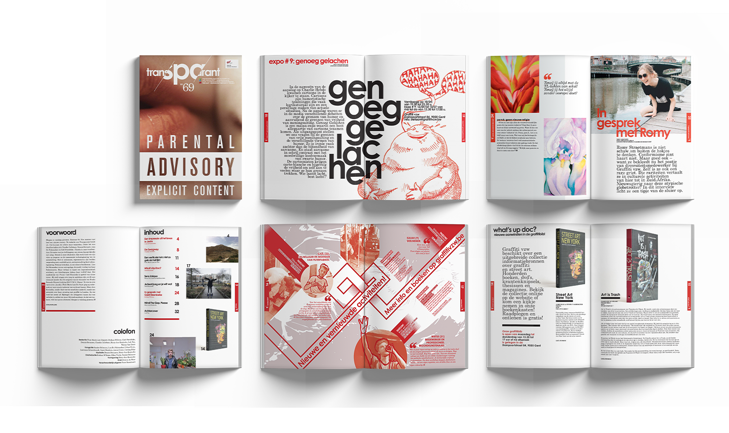 I worked on the three-monthly published magazine, “Transparant” for the non-profit Graffiti VZW. As well as creating an attractive layout, I illustrated several full-page spreads when an article required them. Freely distributed; the magazine served as an important point of both internal and external communication. It featured new offerings and activities as well as providing engaging content tailored to the young people we wanted to activate. In order to attract new volunteers, we featured interviews with our current team.